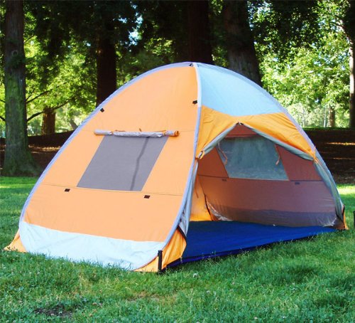 This is a brand new beautiful Cabana Tent. It pops up quickly and folds down easily (no poles needed). The cabana is coated with a layer for UV protection to filter harmful UV rays to protect you from sun, wind and rain. This affordable pop-up shelter tent is ideal for 3 season camping, beach camping, changing and privacy, backpacking, picnic and other outdoors events. It is also an excellent place for kids to play indoors or outdoors -Sizes 82"wide x50"deep x 52"high -UV protection rated 45 SPF -Easy to use - put it up in seconds and folds down in minutes -The back flap opens to allow great breeze -Mesh panels on both ends -The front can be completely closed with zipper for privacy -Sand pockets along the bottom for stability -There are pegs in the package for strong wind -Comes with a handy stack to carry it in -The tent weighs 6lbs and backpack is about 20" in diameter. Notice: due to large sewing demand, residual machine oil may present in small area. This does not affect the overall appearance of the tent.folder video http://www.youtube.com/v/E3NWPXkXe-Y?version=3&